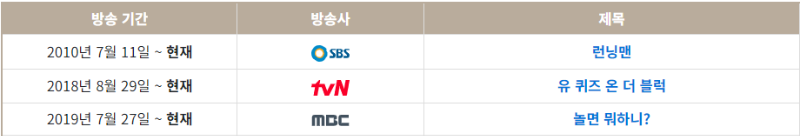 지금은 종영되었지만 MBC <무한도전>만 해도 2005년부터 2018년까지 무려 13년간 615편의 방송을 진행한 바 있고, SBS <런닝맨>은 지금까지도 큰 사랑을 받고 있지요. 유재석이 지금까지 진행하고 있는 장수 프로그램들을 살펴보면 이렇습니다.