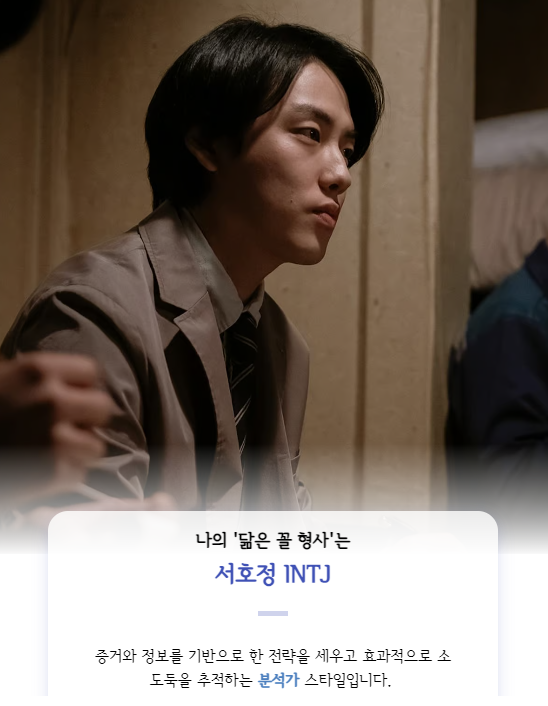 수사반장 1958에 등장하는 4명의 형사들은 캐릭터마다 성격도 천차만별인데요. 감성형, 지능형, 괴력형, 쌈닭형 등. 그래서 드라마 런칭 이벤트로 자신의 형사 MBTI 성향 테스트도 함께 진행 중입니다. 5개의 질문에 답하다 보면 위 주인공 4인방 중 나와 닮은꼴 형사가 누구인지 결과가 나오는데요. 이게 은근히 재미있습니다. 저는 서호정 형사로 나왔네요.