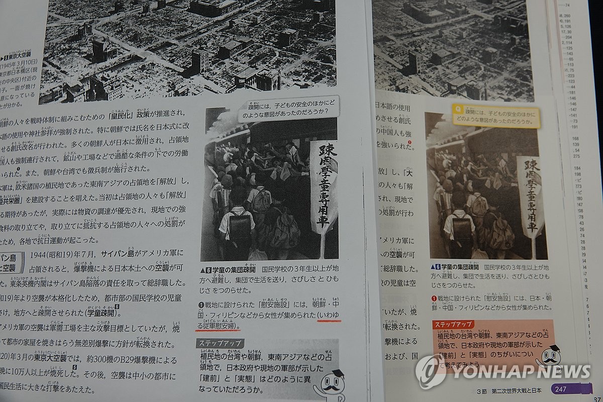 야마카와출판 교과서 역시 "조선·중국·필리핀 등으로부터 여성이 모였다(이른바 종군위안부)"로 적었던 부분을 "일본·조선·중국·필리핀 등으로부터 여성이 모였다"로 바꾸며 종군위안부라는 표현을 삭제했습니다. 더불어 '일본'이라는 표기를 굳이 추가해 놓음으로써 위안부 여성 중에 일본인도 있었다는 점을 강조했습니다. 이걸 일본인도 피해를 입었으니 이해해라는 식으로 합리화하려는 목적인 것인지, 일본인도 위안부에 속해있을 만큼 그렇게 나쁜 것이 아니었다는 억지를 피우려는 목적인 것인지는 두고봐야 겠지만 어떤 쪽이든 납득하기 어려운 것은 사실입니다.