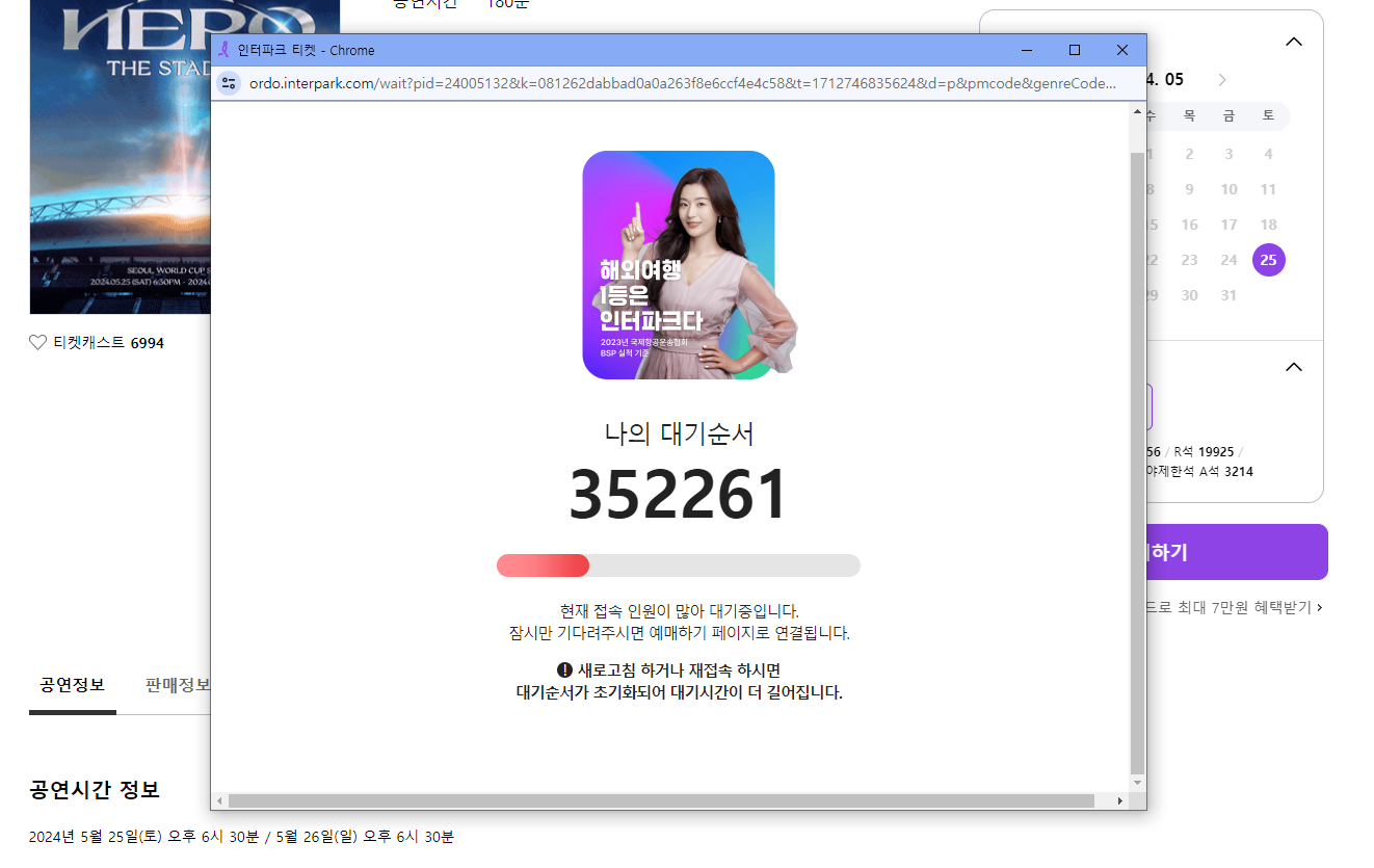 그때부터는 아무 생각도 나지 않았던 것 같습니다. 외마디 비명과 함께 이번엔 절대 새로고침 하지 않으리라 다짐하며 끈질기게 기다리고 있었습니다. 그렇게 20만 명쯤 줄어들어 25만 명쯤 되었을 무렵, 인터파크는 제 기대를 처참히 배신했습니다.