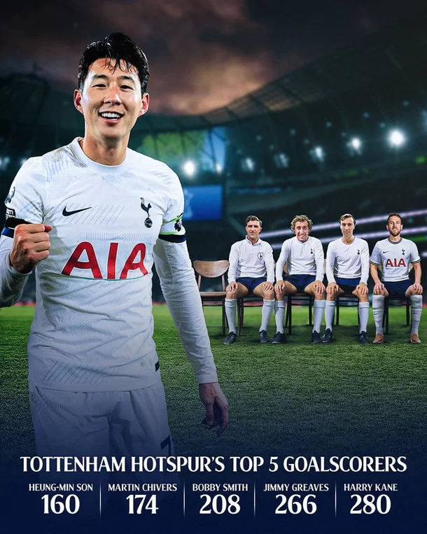 지금까지 손흥민 선수는 토트넘 통산 160호골을 달성하며 구단 내에서 TOP 5위에 이름을 올렸습니다. 현재 더 많은 골을 넣은 토트넘 선수는 마틴 치버스(174골), 보비 스미스(208골), 지미 그리브스(266골) 그리고 현재 바이에른 뮌헨에서 뛰고 있는 해리 케인(280골)뿐입니다.