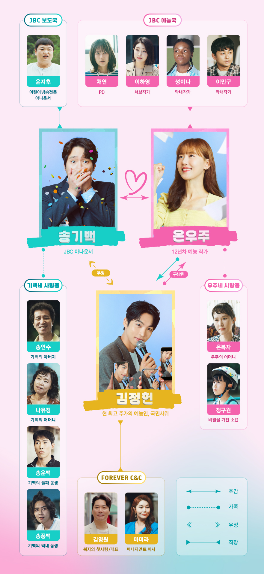 인물관계도만 보아도 앞으로 줄거리가 대략 예상이 되는 느낌입니다. 아무래도 예능인으로서의 길을 걷게 되는 기백의 모습이 스토리의 큰 축을 담당하게 될 터라 예능국 캐릭터들이 상당수 캐스팅되었네요.